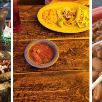 Beef barbacoa wrapped in corn tortillas, covered with salsa verde, melted cheese, mexican crema and roasted corn, served with rice and pinto beans