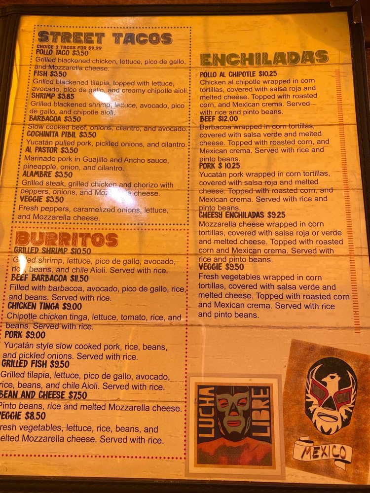 Yucatan style pork wrapped in corn tortillas, covered with salsa roja, melted cheese, mexican crema and roasted corn, served with rice and pinto beans