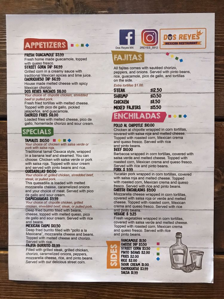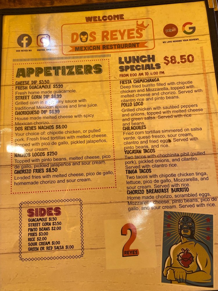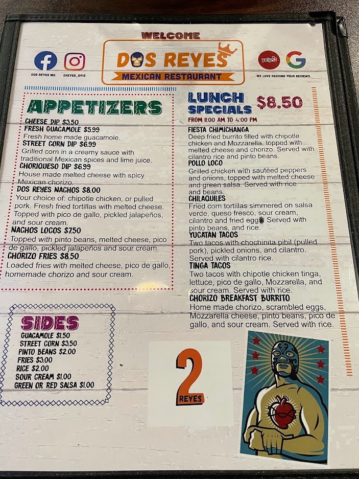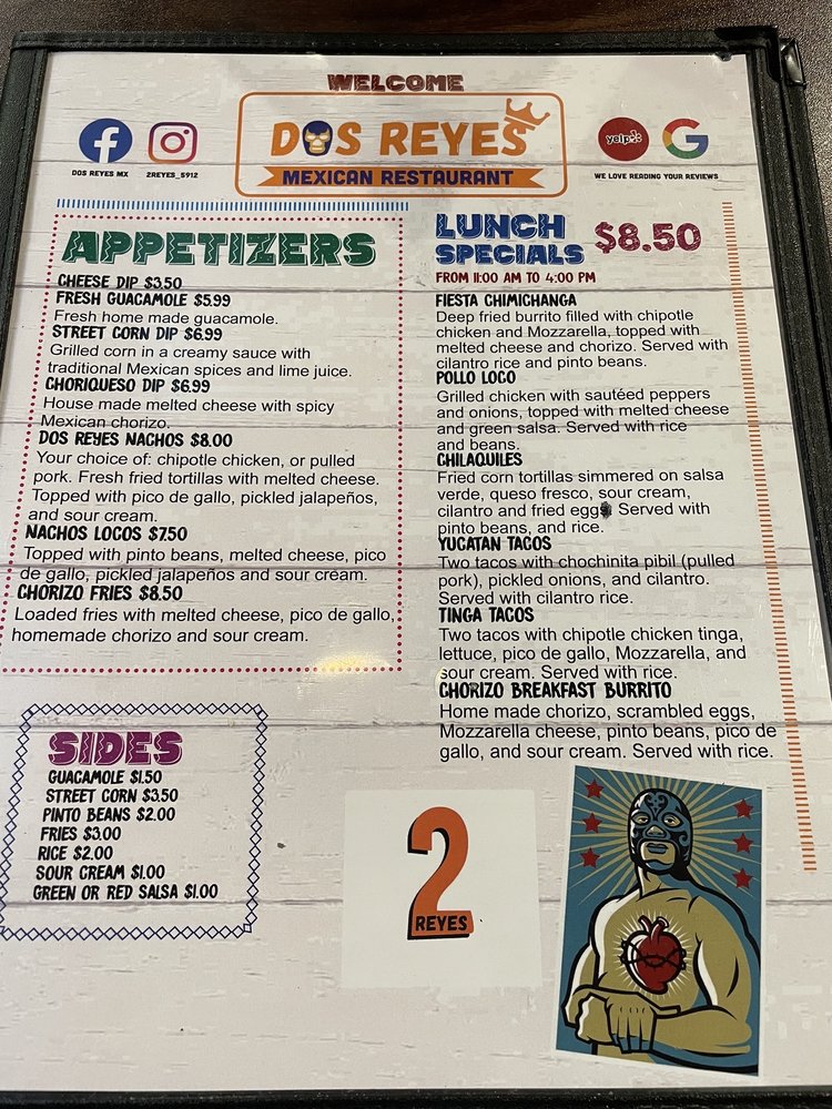 Dos Reyes Mexican Restaurant, located in St. Louis, offers a diverse menu with options for breakfast, brunch, and dinner. Their appetizers range from classic Cheese Dip to more unique dishes like Street Corn Dip and Chorizo Fries. The burritos, chimichangas, and tacos also showcase a variety of flavors and ingredients, such as Grilled Shrimp Burrito and Tinga Chimi. Customers rave about the quality of the food, with mentions of tasty margaritas, flavorful tamales, and strong margaritas. The restaurant provides a cozy atmosphere with outdoor seating, heaters, and friendly service. With a range of options for both meat lovers and vegetarians, Dos Reyes is a must-visit spot for authentic Mexican cuisine in the area.
