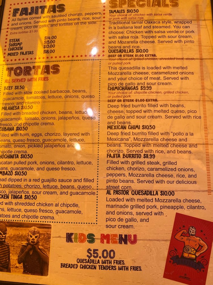 Loaded with melted mozzarella cheese, marinade grilled pork, pineapple, cilantro, onions and green salsa, served with lettuce saur cream and pico de gallo